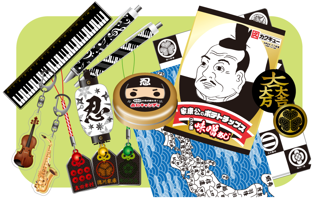 当社オリジナルグッズ、楽器店には音楽雑貨を企画し卸したり、各地の有名な戦国武将の商品、サービスエリアには生活用品や衛生用品など、ご要望に添った商品をすみやかに手配いたします。